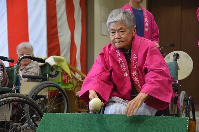 JUGEMテーマ:社会福祉 皆様こんにちは。 10月下旬、グループホーム六尾の郷では運動会を行ないました。 1階の皆様は赤組、2階の皆様は白組となり「エイエイオー!!」の声の大きさを競うところから開始! 1つ目の競技は『スカットボール!』 スティックをかまえて得点の穴を見据える目が真剣そのもの! 力が弱くても、強くても入らず、いざ得点が入ると赤組白組関係なく、大歓声が上がりました。 2つ目の競...