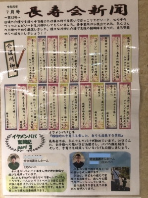 JUGEMテーマ:社会福祉 みなさんこんにちは! 表題の通り、長寿会新聞7月号発刊のお知らせです! 今回は川柳です! テーマは、「介護や支援の中で感じた、仕事に対する思いや、ほっこりエピソード、心の中のツッコミエピソード」です。 また『イクメンパパ奮闘期part3』もお楽しみ下さい! いつもの通り、特別養護老人ホーム六尾の郷1階エレベーター横に貼り付けしておりますので、是非ご覧下さい! 【長寿会 編集...