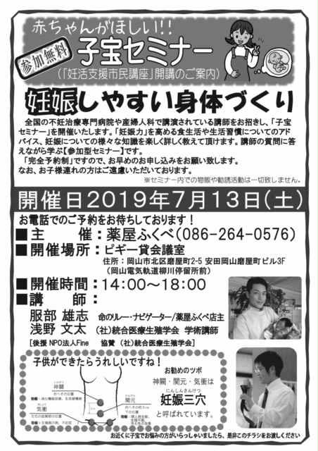 こんにちは! 命のリレー・ナビゲーター、服部雄志です ぼちぼちご予約をいただき始めましたので 改めて告知させてください 【子宝セミナー】 日時:7月13日(土)14時から 場所:ピギー貸し会議室 参加費:無料 統合医療生殖学会から講師をお招きして 妊娠するための生活術などを幅広く学べる貴重なセミナー 当日は販売行為など一切行いません 完全予約制となっておりますので 年内の妊娠を目指す方...