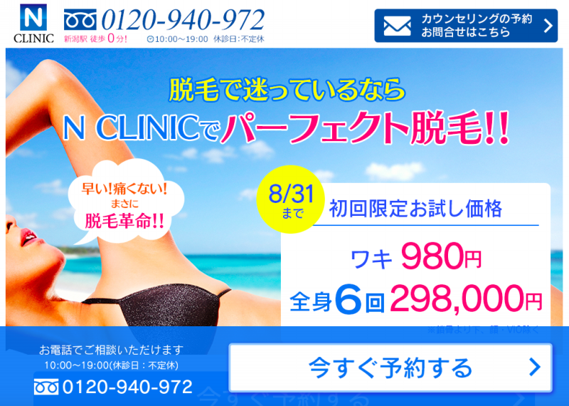 JUGEMテーマ:全身脱毛 N CLINICは、 美容外科・美容皮膚科・美容内科・脱毛専門のクリニックとして、 JR新潟駅徒歩0分 新潟市中央区花園に2017年4月17日に開院いたしました ただ今、OPENキャンペーン価格として、 とってもお得な料金設定になっています N CLINICでは、 美容全般に関するご...