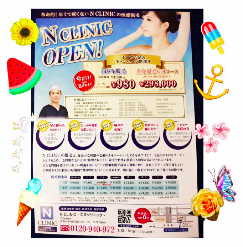 JUGEMテーマ:全身脱毛 NクリニックOPENキャンペーンで、 脱毛がお安くできちゃいます さらに、 今ならサマーキャンペーンもやっていますので、 もっとお得にできちゃいます サマーキャンペーンの情報も 追ってお知らせしますね! お気軽にお問い合わせ下さい N CLINICでは、 美容全般に関するご相談や質問も承っておりますの...