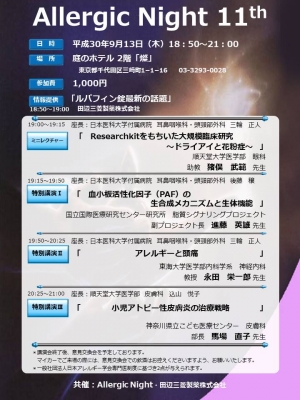 下記の通りAllergicNight 11thを開催させて頂く運びとなりました。 本会は、実地臨床に直結したアレルギーのホットでいきがよい話題を取り上げ、研鑽していくことを目的としております。 ミニレクチャーには順天堂大学医学部 眼学 助教 猪俣 武範 先生より「Researchkitをもちいた大規模臨床研究〜ドライアイと花粉症〜」、特別講演?として国立国際医療研究センター研究所 脂質シグナリングプロジェクト 副プロジェクト長 進藤 英雄 先生から「血小板活性化因子(PAF)の生合成メカニズムと生体機能」について、特...
