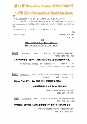 今年も、暑い名古屋で、第11回 Biomedical Frontier TOKAI (BMFT)〜NIH (New Information of Health) in Japan(旧NIH東海会)が開催され、以前に留学された方、これから留学する方あわせて49名が出席されています。 今回もプログラムの通り極めてattractiveな3題で、どれも鳥肌が立つような内容でした。この会は、2000年に名市大ウイルス学の田中靖人教授と私がMarylandで始めたNIH東海会がルーツだと思っておりますが、田中教授のオーガナイズによりこのようなハイレベルの会が国内で続いています。 当時...