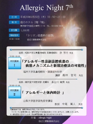 この度、下記の通りAllergic Night 9thを開催させて頂く運びとなりました。 第9回は、岡野 光博 先生、高井 敏朗 先生をお招きして、開催を予定しております。諸事ご多忙の折りとは存じますが、是非ともご出席賜りますよう宜しくお願い申し上げます。 記 ●日時: 平成29年9月6日(水)18:50〜21:00 ●場所: 庭のホテル 2階「燦」[アクセス] 東京都千代田区三崎町1-1-16 Tel:03-3293-0028 ●参加費:1,000円 ●情報提供:「タリオン錠最新の話題」田辺三菱製薬株式会社 JUGEMテーマ:ドライノーズ