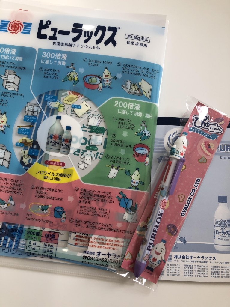JUGEMテーマ:アナタが住む私の世界 いつかは晴れると知ってはいるけれど、今は心の中で明るく輝く日の光を描きながら日々の臨床に励みましょうか。 皆様こんにちは。 新型コロナウイルス対策は、基本的な事を心がけて拡大を防いでいきましょう。 ただし、心には余裕とゆとりをもって不安になりすぎないようにして下さいね。 普段院内で利用している次亜塩素酸ナトリウム溶剤の取り扱い資料を送付して下さいました! マスコットの4色ボールペンが可愛い...