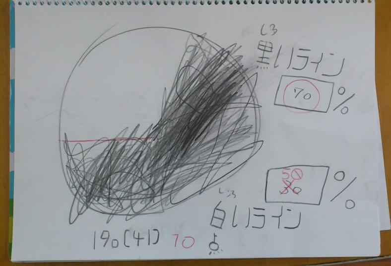 JUGEMテーマ:自閉症スペクトラム、発達障碍 夜寝る前に、カイが 「クイズやろう!」 と言ってきた。 すぐにカイが紙に問題を書き出した。 すでに構想があったらしい。 パーセント、割合の問題だ。 空欄の四角に、 黒70パーセント、白30パーセントと書いたが、 カイは、 「黒は70パーセントで正解、白は50パーセント!だから間違い!」 と言って、赤入れをした。 足して100パーセントにならないといけないんだけど、 まだ小一ではパーセント習ってないはずなので、 まぁいいか〜と流し...