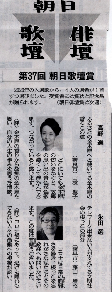 JUGEMテーマ:日本文学 第37回朝日歌壇賞が、朝日新聞紙面に発表された(2020・1・10)。 高野選の「ふるさとの金木犀へと続いてる金木犀の香るこの道(奈良市)山添聖子、馬場選の「『10年後の理想のあなた』たずねられ言葉をさがす一次面接 富山市・松田梨子」は、この数年よく採られているし、その親子、きょうだいの作品もよく選ばれて、朝日歌壇の読者にはお馴染みの「歌詠み」家族なので、選者もそれを頭に置いてのご褒美だった、と思われる。 その何よりの証明が、歌壇賞記事の隣の今週の...
