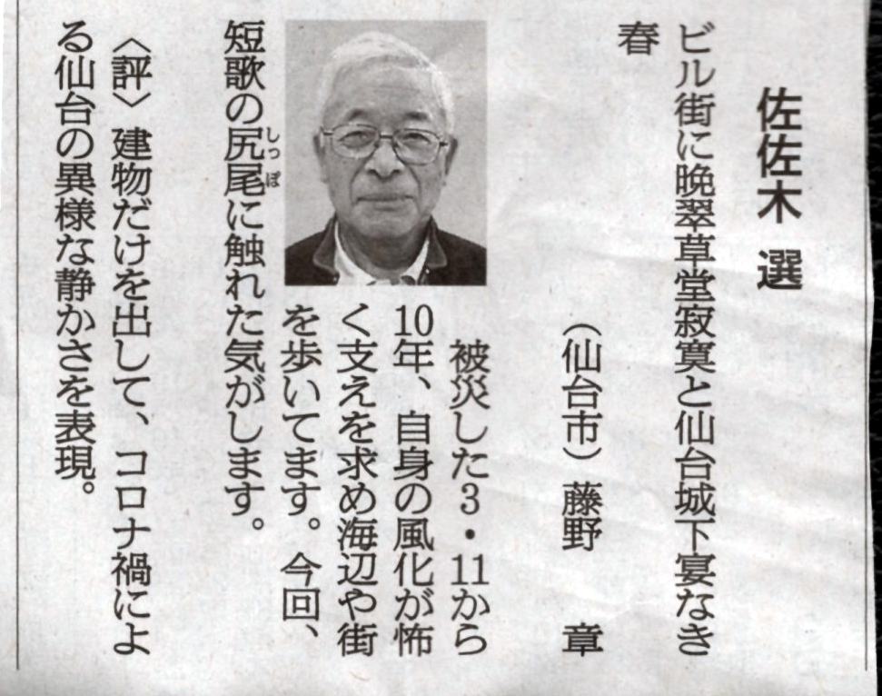 JUGEMテーマ:日本文学 今回の第37回朝日歌壇賞で私が最も心惹かれたのは佐々木選の 「ビル街に晩翠草堂寂寞と仙台城下宴なき春 (仙台市)藤野 章」だ。晩翠草堂は昔々訪れ、主の晩翠存命当時とその後に触れ、後に『仙台 晩翠草堂の顛末』を読んで、晩翠旧宅敷地譲渡めぐって紛争のあったこと、その紛争に心痛めた遺族がその顛末を、やむぬやまれずこの書で公表したことを知った。 晩翠草堂を訪れた時、仙台市は七夕祭りで賑わっていた。夜は花火があった。藤野氏の「仙台城下宴な...