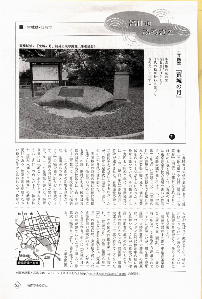 JUGEMテーマ:日本文学 ずっと以前のことになるが、hp「カメラ紀行 名作のふるさと」に晩翠草堂を取り上げたことがある。 https://bungakusanpo.oops.jp/0507sendai/bansui.htm 雑誌『月刊国語教育』に連載した「名作のふるさと」に、晩翠「荒城の月」を掲載したこともある。