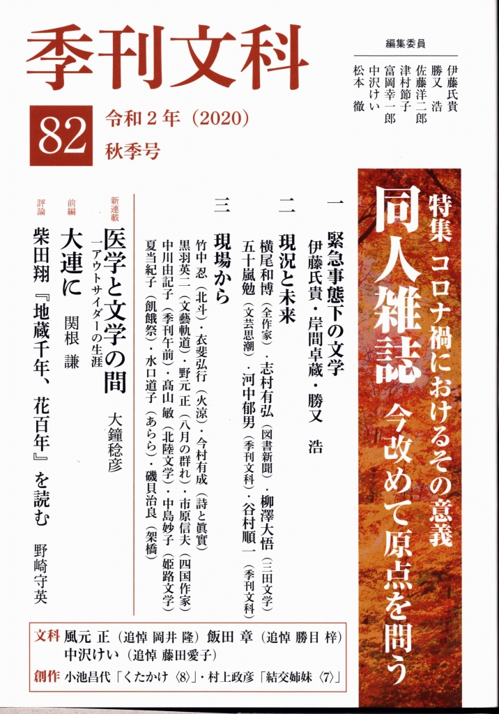 JUGEMテーマ:日本文学 ◆『季刊文科』82号が発売になった。 特集は、コロナ禍における同人誌。今改めて原点を問う、の見出しが表紙に踊る。 巻頭の「一 緊急事態下の文学」の伊藤氏貴氏は、カミュの『ペスト』の場合、街の封鎖は長期に及び、切り離された街の外と内とで様々な問題が生じたが、ペスト禍は過ぎれば日常が回復された。しかしコロナ禍の場合は、現在の状態が「新しい日常」になって、以前の日常にはもう戻れないのではないか。「ソーシャルディスタンス」「オンライン」そしてマスク、世界規模で変わった...