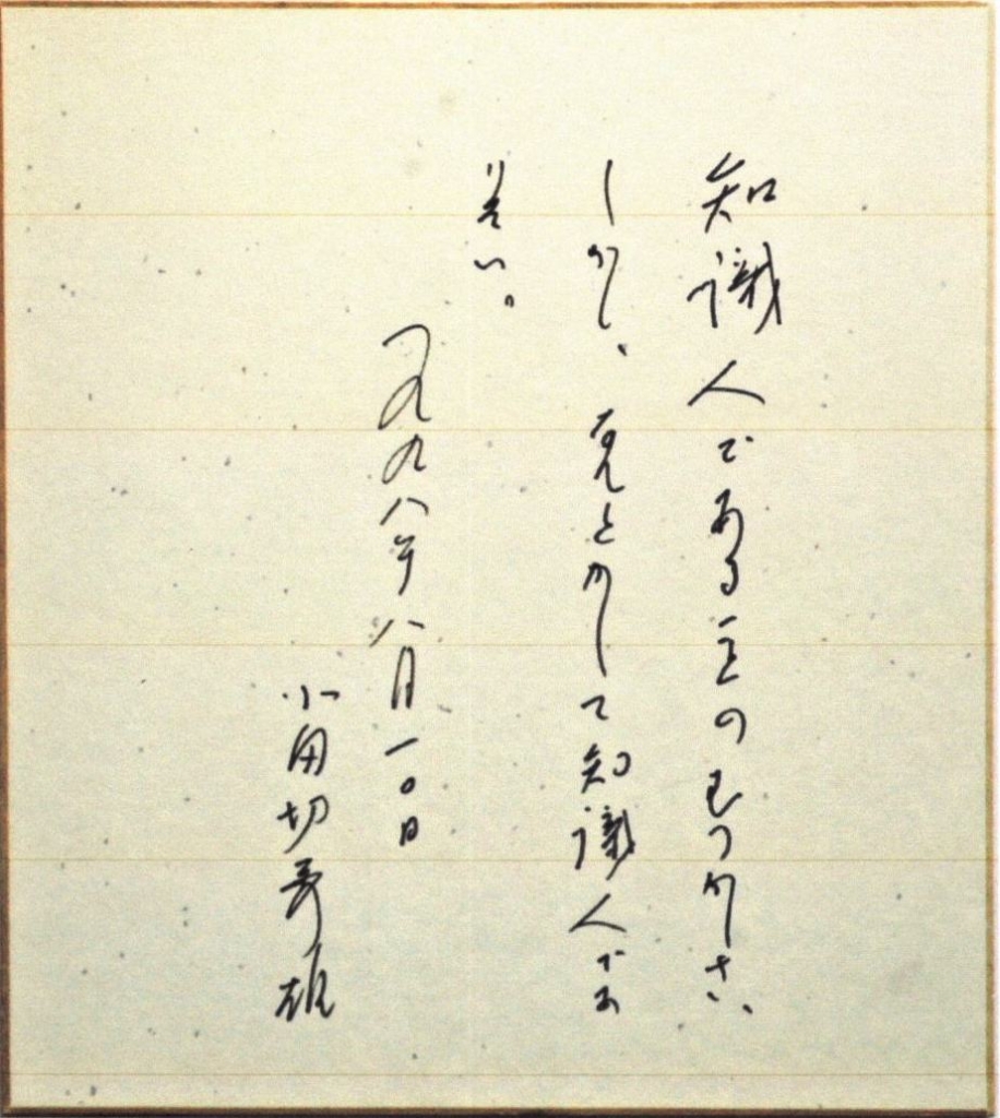 JUGEMテーマ:日本文学 ◆小田切先生の色紙 ある時、小田切先生から突然電話があって、「君とは長いつきあいだが、まだ君の家に行ったことが無い。一度表敬訪問をしたいが、どうかね」とおっしゃる。びっくりし恐縮もしたが、もちろん喜んでお受けした。気のはやい先生は、その翌日早速お見えになった。手土産にされたケーキの店サンスーシの女将(おかみ)は、鷗外論などもある聖心出の人で――とか、東京新...