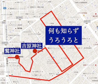 JUGEMテーマ:エッセー・紀行文 さてアスファルトの境内に入ります。おや、何かが置いてありますね。あー、これはすごい。「なでおかめ」だそうです。 なでる場所で願いが叶うとか。おでこ:賢く、目:先見、鼻:金運、頬:健康・恋愛、口:防災、全体を丸く:物事が丸く収まる、だそうで。一応全部やっておきました(笑)。さー、あっさり終わりましたが、私のプランはまだまだです。ここから少し東の路地に入ります。吉原、あの吉原です。まずは吉原神社に寄りましょう。弁財天を祀り、開運・芸上達だそうです。水子では...
