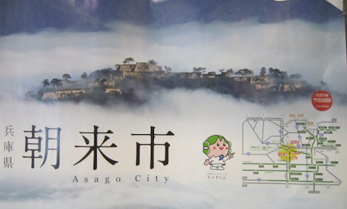 JUGEMテーマ:エッセー・紀行文 朝来市・竹田城跡 http://www.city.asago.hyogo.jp/category/2-0-0-0-0.htmlあー、ここに広告がありました。朝来市の竹田城跡です。時間とJR便の都合がつけば、この竹田城跡に行きたかったのです。天空の城ラピュタ並みの、雲に浮かんだような城跡が有名です。しかし、この1ヶ月ほど前に、この城跡が観光客が多すぎて都合が悪くなり、しばらくは城跡に入れなくなってしまいました。有名になりすぎるって大変です。私としては残念です。さて、何はともあれ、帰りましょう。再び1時間半の徒歩。汗を...