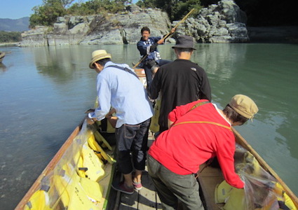 JUGEMテーマ:エッセー・紀行文 一番最後に乗り込みましたところ、そこがなんと舳先(へさき)でした。結局、船の一番前の右側に陣取りました。まずはライフジャケットを着て、水よけのビニールシートを確認します。さて、出発。竿で船を押し、静かに進みます。あー、風が気持ちよい。舟っていいですね。流れがゆっくりの所もあれば、いくつか水しぶきが上がる急流もあります。大きな岩をすり抜けたり、そこそこスリルがあります。舟の前には漕ぐ役、舟の後ろにはガイド役の二人が乗っています。楽しい話も川下りの楽しみの一つで...