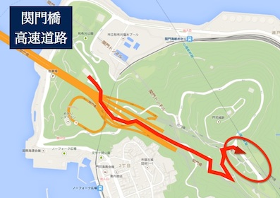 JUGEMテーマ:エッセー・紀行文 図のように登ってきて、楕円形の広場に着きました。ここが関門橋を一望に出来る場所なんです。ここは過去2-3回訪れていますが、気持ちが良いところです。今日は特に晴れていますからね・・。とはいえ、PM2.5を含むもやが掛かって、気分は100%上機嫌ではありませんが(苦笑)。しばらくここで景色を楽しみながら足を癒します。下関側の景色です。この後、この少し後ろ側の広場に行きましたが、家族連れが遊んでいるだけ。ま、そんなものでしょう。さ、だいぶ疲れてきました。下山します。