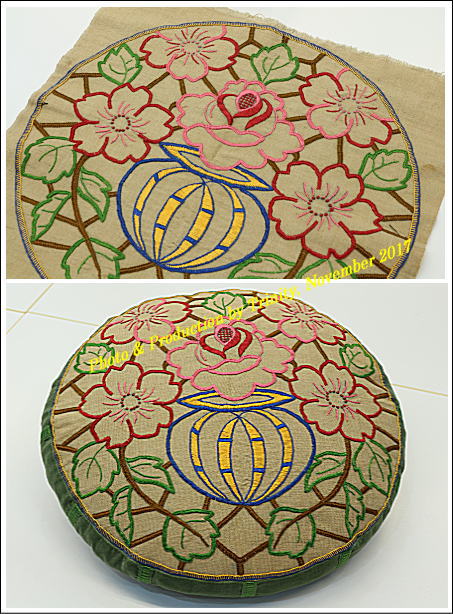 ◆ クッション制作をご依頼のお客様に昨日お渡しした作品。「アンティーク」であるという生地を持込みされたものは、円形の中に壺に飾られた刺繍の花々の印象は、アジアンチックな雰囲気。 ◆ 刺繍の楕円形に合わせ、ヌードクッションも発注。 生地とともにご持参されたブレードは、アクセントに縦使いさせてもらいました。裏側生地には、表地の縁に刺繍されたものを同じように、刺繍を施してみました。 頼まれてもいないのにデス・・・<苦笑>。 どこでやめるのか、どこまでやるか・・・なかなか判断の難しいとこ...