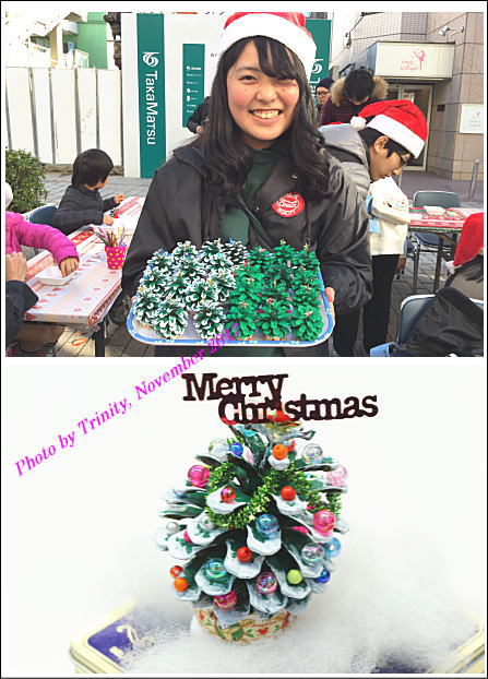 ◆ 教室前にある緑道には、毎年恒例の大きなクリスマスツリーがお目見えする。 今年は昨日の土曜日がその日ということで、お昼に外にでたら、緑道は大賑わい!! その中に誰でも参加できる「小さなクリスマスツリーを作る」コーナーを見つけ、ランチ帰りに飛び入り参加<笑>。 ◆ 見渡せば、作っているのは小さなお子ちゃまばかり。 むむっ、ホントにいいのかぁ〜と思いつつ作業続行。松ぼっくりをツリーに見立てたものに、糊でビーズをくっつけるだけの10分程度の街頭ワークショップ。 とってもかわいく...