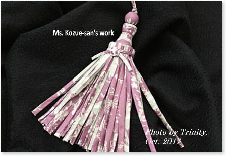◆ 最近、遠方他県から入学された生徒さんのタッセルをご紹介しましょう。 道具入れバッグに飾っていたタッセル。 見逃しませんでしたよ!<笑>。ご本人いわく、まだ初心者なので、糸できちんと作ることができないということで、布で作られたんだそうです。 私の頭の中にも以前から「布のタッセル」の発想がありましたが、先を越されてしまいましたぁ〜<苦笑>。 誰でもが作ることはできない、なぜなら「生地」を知らないとできないことを私は理解してますからね〜。この発想、とってもクール!! ...