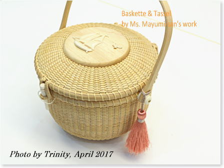 ◆ 先月、外部教室で実施したシンプルなレーヨン糸のタッセル作り講座。 その後、ご参加いただいた方の中から、店頭に糸を購入しに見えられた方もいらっしゃって、嬉しい限りです!! その時、別の特別講座も申し込みされ、受講時にご自分で作られたタッセルと、完成したばかりというバスケットに付けて見せていただきました〜。 ◆ バスケットに合うタッセルというと、黒やベージュなどの無彩色を想像しますが、なんとスモーキーなコーラルレッドの色にカフェオレの紐とネックアクセント。 バスケットに色物...