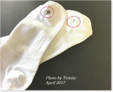 ◆ 今朝はスニーカーを履いて行こうと決めたので、靴下を取り出した。履くときに「あれっ、こんなところに文字がかいてあったっけ〜!?」 右と左という意味か、LとRが付いている。子供じゃあるまいし、左右どうはいたって私の勝手だよね〜。 なぜわざわざ識別するのか不思議。つま先が5本指の靴下だったら間違えたら大変だけど・・・<苦笑>。これがまたかわいいなんて言う人も、世の中にはいるんだろうなぁ〜。 ◆ 最近私が靴下を購入する場合、同じ色をまとめ買い。片足紛失しても片足のゴムがへたれても、代替足...