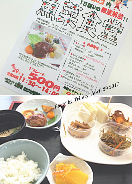 ◆ 今日のランチは、教室のある当ビル3Fのお料理教室を一日解放した「魚菜食堂」でいただきました。 前日の夕方、ロビーの掲示板を何気に見たら、なんと4月29日(土・祝) 1日限定の食堂が開かれるとあるじゃないですか〜! 500円です!! 土曜ご予約の受講の生徒さんの分も、勝手にチケットを購入してしまいました<苦笑>。 なんたって事前にチケットを買うとデザートが付いているというし・・・<笑> ◆ 煮込みハンバーグに、小皿3つをよりどりみどりで選択。出汁巻き卵入りサンド、タケ...