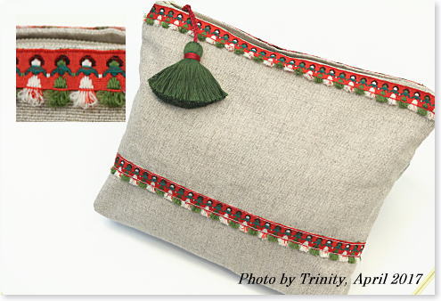 ◆ 先日布用の糊を購入しに、ゆざわやさんへ行った時に見つけたかわいいリボン。何がかわいいかって、小さなヒト型の下にスカートをアレンジしたような、ミニのバブルフリンジが付いてます。 1m購入しました。 ◆ 何かに使いたいなぁ〜と思っていましたが、バッグの中に入っているポーチを作り替えることにしました。 今使っているのは、少し大きくて物が取り出しにくく、少し小さめに、そしてファスナー付きにしました。 自分のものなので、ま、適当なアレンジで・・・<苦笑> でも、しっかり裏地がついてま...