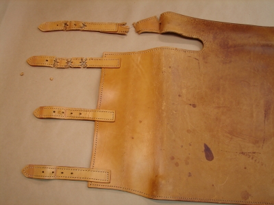 JUGEMテーマ:修理 さて、前回に続きスパニッシュチェアのお話です。 今回も背もたれです。 <Before> ベルトのちぎれ、そして筒状に巻かれた部分の割れが見られます。 割れ部分の拡大画像です。 縫ったところは、切り取り線のように革が切れやすいところです。 この部分は新しい革に取り替えます。 <After> オリジナルの革に近い色の革でなるべく違和感のないように。 これ...