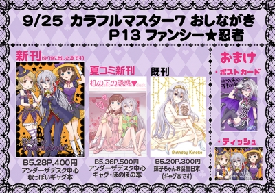 9/19のイベント、お疲れ様でした。 沢山の方に本をお手に取って頂き、本当にありがとうございました。 おかげさまで新刊、持っていった分は完売しました。 ハロウィンネタは早すぎるかな・・・?と思ったのですが そんなこともなさそうですね。遅いよりはいいかな・・・? ハロウィン本、前から一度作ってみたかったので 作って本当によかったな、と思います。 明日の大阪でのアイマスオンリー、参加させていただきます。 スペースNo,はP13です。 お品書きです。 やっぱり小さいサイズ...