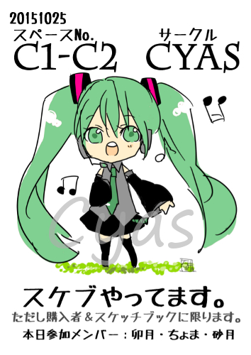 こないだとは打って変わって涼しくなりましたー ただ告知のタイミングは変わりません('ω') おで浜明日だょ!← 10/25(日) アクトシティ浜松 展示イベントホール おでかけライブin浜松177 スペースNo:C1-C2 サークル名:Cyas JUGEMテーマ:同人活動 参加しますー(=゚ω゚)ノ ミクさんのイラストの紙を入口側通路にぺろって出しときます。だがしかしはずかしい(/ω\)どうしようか。 ボカロメインに超雑多ジャンル展開していますので見てってやってください! 今回・前回の新作は、血界戦線の...