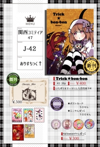 JUGEMテーマ:同人活動 ありすちっく†関西コミティア47新刊 Trick★bon-bon 400yen 鮎と、とろじーの合同本です。 [いたずら]がテーマの、ハロウィンちっくな一冊になっております。 サンプルはこちら↓(pixivに繋がります) 【関西コミティア47】新刊サンプル【J-42】 | 鮎 [pixiv] http://www.pixiv.net/member_illust.php?mode=medium&illust_id=52728118