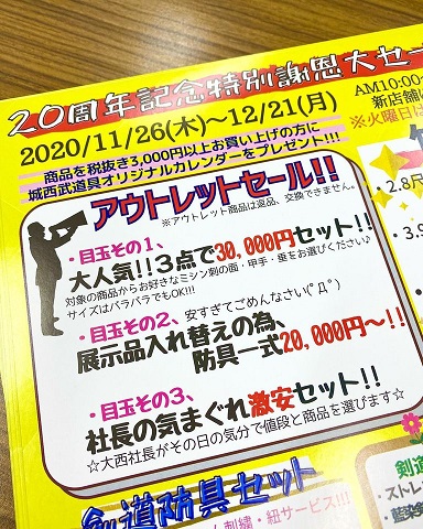 JUGEMテーマ:剣道 こんにちは(^^)/もえです🌼🌼 最近は年末セールの話し合いを毎日しております㊙㊙ 実は城西武道具、今年の12月で20周年なんですよ〜✨✨ しかしコロナ・・・ いつもは4日間でギュギュっとやっておりましたが、 今年は密を避けてということですからね・・・ 毎日こうしたほうが良いかな、これは大丈夫かな、 などなど話し合いをしながらセールに向けて色々決めています(^^♪ 今のところ、...