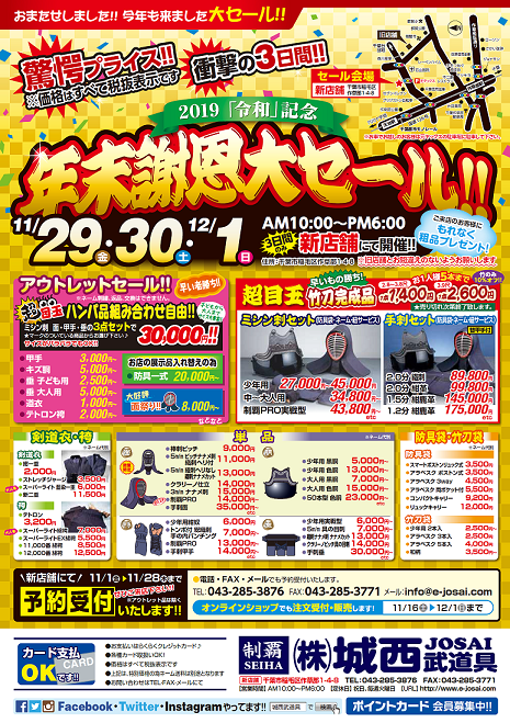JUGEMテーマ:剣道 こんばんは(^^)/もえです🌼🌼 こんな夕方にブログを更新するのは初めてかもしれません(笑) 今日は1日セールの片付けに追われていました・・・ お店の中はなんとか片付きました〜( ;∀;) 城西武道具は商品数が多すぎなんです(笑) さぁ、セールの様子を皆さんにもお伝えさせて頂きます!!! 毎年恒例激安年末大セール!!! 私が急いで書いた案内(笑) 初日は快晴!!! ...