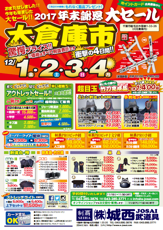 JUGEMテーマ:剣道 こんにちは(*^^)vもえです 城西武道具の年末大セールがどんどん近づいてきてますね セールって言葉、いいですよね(笑) 私、この言葉に弱いです笑 さて、今回もブログを見て下さった皆様に特別 セールのチラシを大公開しちゃいます じゃじゃ〜〜〜〜ん 画像が小さくてわかりにくいかもしれませんが・・・ ネットで公開するのは初でございます 大きく見たい方は、11月25日発売の...