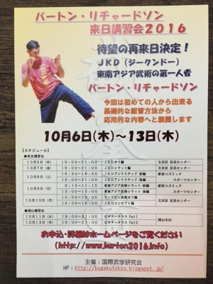 ダン・イノサント師や数々のレジェンドの元でジークンドーやカリシラットを学んだ、 バートン・リチャードソン先生が今年も来日。もうすぐです。 チラシを頂きましたので参考までにアップします。 この前聞いた時はまだ空席あるよという事でした。 去年参加させていただいた時は、とてもオープンな雰囲気なセミナーでした! セミナー中に使う、カリスティックやトレーニングナイフは無極堂JAPANをご検討下さい。 選定のご相談にものります! まだ10/4まで配送も間に合...