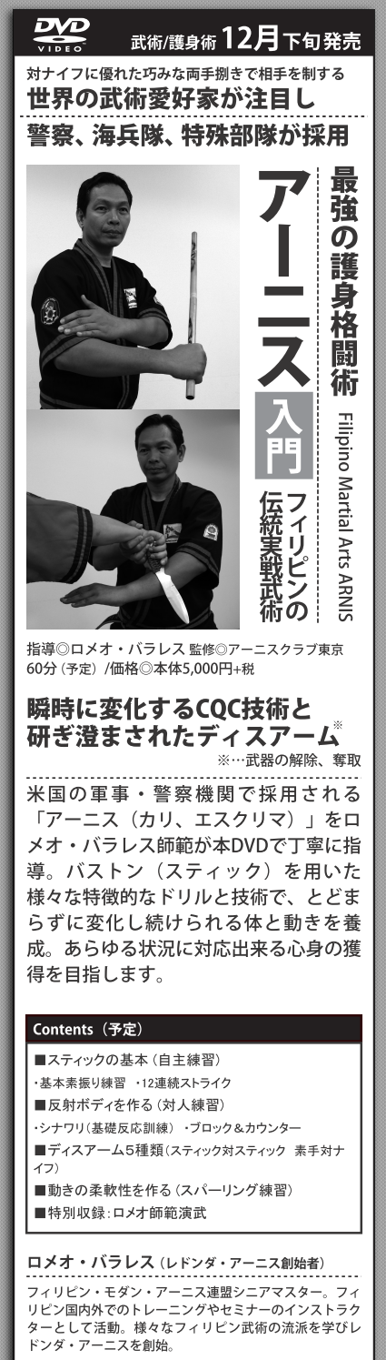 BABジャパンさんのカリの日本語DVD制作に伴い、企画からお手伝いさせて頂きました件でDVDのリリースが決定しましたのでお知らせとなります。 「フィリピノカリ」とは、ブルース・リーの創始した截拳道を継いだ、ダン・イノサント師(ブルース・リー師に出会う前からフィリピノカリやシラットの達人)が、アメリカで「カリ・シラット」として有名にしてくれましたお陰で、日本ではジークンドーが一番大きな勢力である事から「カリ」という言葉が標準語となっているようです。 現地ではアーニスやエスクリマ(スペイ...