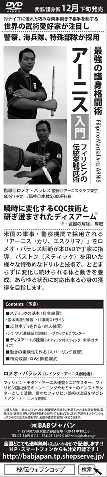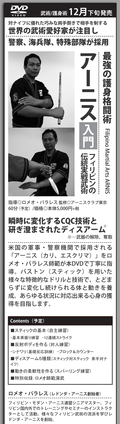 DVDリリースされました! BABジャパンさんのカリの日本語DVD制作に伴い、企画からお手伝いさせて頂きました件でDVDのリリースが決定しましたのでお知らせとなります。 「フィリピノカリ」とは、ブルース・リーの創始した截拳道を継いだ、ダン・イノサント師(ブルース・リー師に出会う前からフィリピノカリやシラットの達人)が、アメリカで「カリ・シラット」として有名にしてくれましたお陰で、日本ではジークンドーが一番大きな勢力である事から「カリ」という言葉が標準語となっているようです。 ...