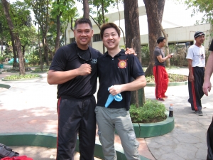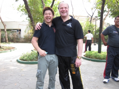 Juerg Zuegler (ジャレグ・ジグラー)氏はスイスを中心に、 KOBMATAN ARNIS(コンバタン・アーニス)を指導されている グランド・マスターで、門下生も15000人とか。 コンバタンアーニスとは、モダンアーニスの祖であるレミー・プレサス一家の Ernesto Presas によって創始された、流派です。 たまたま日本人という事で、好感触をいただいて、色々質問しているうちに、 アシスタントとして、受けを取らせていただきました。 ↑写真の右手にかぶっていますのが、クンタオ(素手重視のフィリピン式シラット)のマスターで...