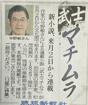 JUGEMテーマ:空手道 (7月27日一面から) 空手家であり作家の今野氏が琉球新報で描き下ろした連載小説「ムトゥブザールーこと本部朝基」「チャンミーグヮーこと喜屋武朝徳」については、当時、現在進行形(?)でこのブログでもいろいろ書いてきた。 琉球新報で連載される氏の空手小説は、県内空手家及び関係者のみならず多くの人に絶賛された。その今野氏が三度、書き下ろす連載小説が始まる。\(^o^)/ &...