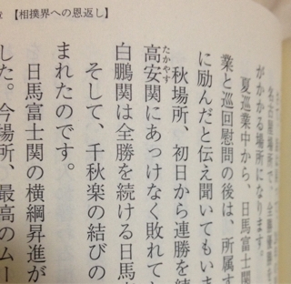 JUGEMテーマ:相撲お気付きの方もいるかもしれませんが第36代の木村庄之助さんが引退後に発行した『大相撲 行司さんのちょっといい話』その147ページに誤植があるんです。(平成24年)秋場所、初日から連勝を続ける日馬富士関に対して、10日目、白鵬関が若手の高安関にあっけなく敗れてしまい、1敗。これ、高安関ではなく栃煌山関なんですよね(つд⊂)あの時の栃煌山関の「信じられない!」という顔はとっても印象的でしたし当時高安関は一度も白鵬関に勝ったことはありませんでした。でもいつか高安関に白鵬関を倒してほしい!と密かに...