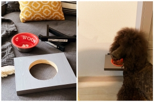 JUGEMテーマ:わんこ JUGEMテーマ:DIY 新年早々に再開した家のリフォーム(今回は玄関エリア)は、床のタイル貼り替えがあまりにもスムーズに終了したので、その勢いに乗って早々壁に着手したものの、壁紙を貼るだけの楽勝作業と息巻いていたのが遠い昔の出来事のようにてこずっています。 庭をいじり始めたり、犬猫の小物づくりをしたりしながら、玄関の壁作業から目を逸らす現実逃避の日々です。 フードボールを壁に取り付けました 今まであまり意識したことのなかった食器スタンドの必要性。体...