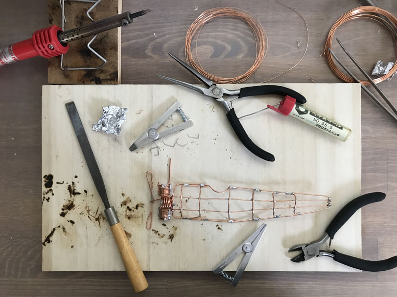JUGEMテーマ:DIY ワイヤーアートとでもいうのだろうか。 銅線、真鍮線とハンダで、「何か作ったらおもしろいかも」というノリで 作ったもの。 ハンダは1か所を熱すると、近くのハンダも溶けてしまう。 一か所ずつ放熱クリップとアルミホイルで周囲への熱伝導を抑えながらの作業となり、 結構めんどくさいものがある。 深海魚:チョウチンアンコウ 製作:2017年6月 深海魚:未知の魚 深海にはこんな道の魚類がいるかもしれない(適当...