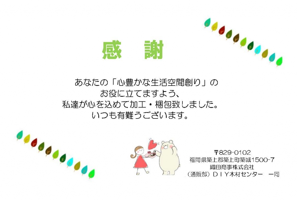 JUGEMテーマ:DIY ============== 感謝の気持ちをこめて・・ ============== 寒い日が続いております・・ ここ九州・築上町も、大寒波襲来でございます。 大雪のあとの道路の凍結で、出社できないパートさんもいるほど 皆さん、無理をなさいませんように。。 さて。 通販部では、梱包の際にお客様への感謝の気持ちを込めて カードを同梱いたしております。 ただいま、バレンタインバージョン でご...