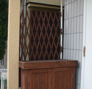 玄関を開けて右手、お隣との境目 腰高の木製物置の上に伸縮式のトレリスを付けていたんですが 丸見えです。 一応、お隣の玄関は向こう側なので、しょっちゅうバッタリ☆なんて事は無いのですが・・・ もう少し何とかしたいなぁ〜 と昨年思い立ちまして すのこ2枚組を買ってきました。398円也。 もともと家に余っていた すのこが2枚あったんですが、それは設置場所とサイズが合わなかったので解体して枠として使用。 上下をもう少し真ん中に寄せてコレだけでも良かったんだけど、なんだか すの...