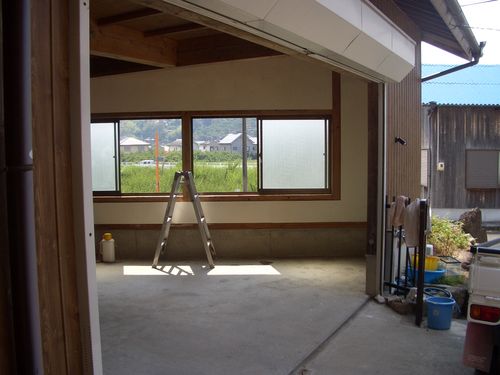 JUGEMテーマ:日々のくらし JUGEMテーマ:DIY ここはK邸に隣接する車庫です。 とても立派な車庫で、普通車でも並べて2台を余裕で置けるくらいの広さがあります。 Kさん、学習塾を今よりも本格的にしていくということで、この車庫を有効に利用し、塾の教室として活用することになりました。 机といすで場所をとるものの、詰めれば生徒が20人くらいは入れそうな勢いの、かなりまとまった広さがある車庫なんです。 今回はここが教室に生まれ変わります。 ということですので、表側に壁を設ける必要があります。 出入り口...