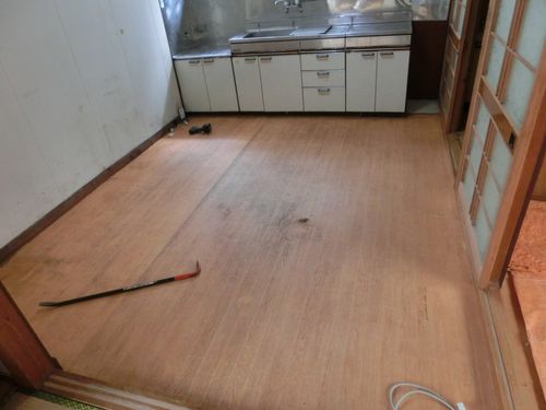 JUGEMテーマ:日々のくらし JUGEMテーマ:DIY ダイニングの床がへこむ箇所があるとのことで、下見に行ってみたところ、そこここで下地である合板が腐食しているみたいだ。 昭和に建てられて、良くある症状。 合板は湿気に弱い為、床下の下地に使ったりしていると、たちまち腐食の原因にさらされ、ぶよぶよになってきますね。 仕上げに今回のようにクッションフロアが敷いてあったりすると、なおさら木材の呼吸も出来ないので、腐食を早めることになるんだろうなあ。 キッチンを撤去し、古いクッションフロアは全...