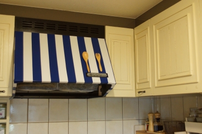 JUGEMテーマ:DIY 今日はキッチンDIY第三弾 換気扇カバーのDIY 白い扉にDIYして フレンチカフェ風にしたキッチンに 黒いレンジフードカバーだけが似合わない ということで カフェのオーニング風にDIYしました ブルーと白のストライプの さわやかなカフェのオーニング風 かわいい〜〜〜 (と自己満足) 今までのセルフDIYの中で1番のお気に入りになりました ちなみに下がもともとのレンジフードカバー ナチュラルキッチンで買った 木のスプーンとフォークの裏に磁石をボンドで...
