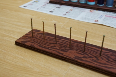 JUGEMテーマ:DIY 昨日の続き 今日は昨日乾かしていた材木を組み立てます 板に釘を均等に打ち付けます この時釘が板を貫通しないように8mmくらい打つのがポイント 慣れるまでは釘に8mmのところに印をつけておくと 深く打ちすぎることもありません 糸と糸がぶつからないか・・・ 取り出しやすいかいったんチェック うん 大丈夫 と確認したところでついに組み立て 組み立ては楽しすぎてついつい写真を撮るのを忘れました なので いきなり完成図 上の小さなスペースは...