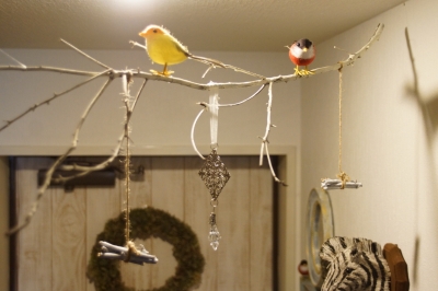 JUGEMテーマ:DIY ちょっとした玄関のDIY第三弾 天井に小鳥の止まり木を作りました 近所の公園で拾ってきた木の枝を 水性のバターミルクペイント 13-25 Corner Cupboard Yellowish White でかすれるようにラフに塗装 3COINSで買った小鳥さん2匹を木に止まらせて・・・ セリアのオーナメントや拾ってきた小枝をペイントして麻紐でくくったものを吊るして・・・ 天井にてぐすで吊るすと 玄関が小鳥の止まり木みたい 天井の高いところなので頭がぶつかることもないし 家に帰ってくると小鳥さんがお...