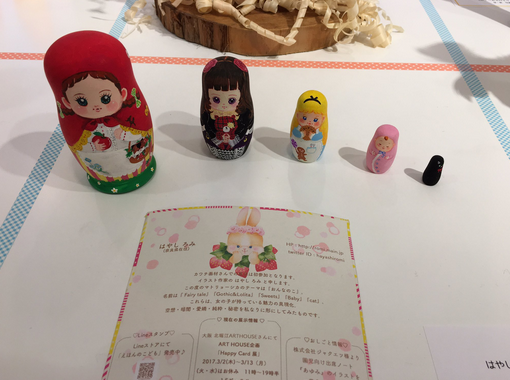 初めてのマトリョーシカ展示、ぶじ終えられたようです♪ 遠くから足を運んでいただいたお客様もいらしたようです。 ご覧くださった皆様、カワチ画材のスタッフ様、ありがとうございます! 私は2日目に見に行ってきました。 有名な作家さんのお隣ブースに飾られていてびっくり。 アイデアのギュギュッと詰まった作品がずらりと並んでいました。 人気投票なんかもあって、ちょっとお祭り気分でした☆ カ...