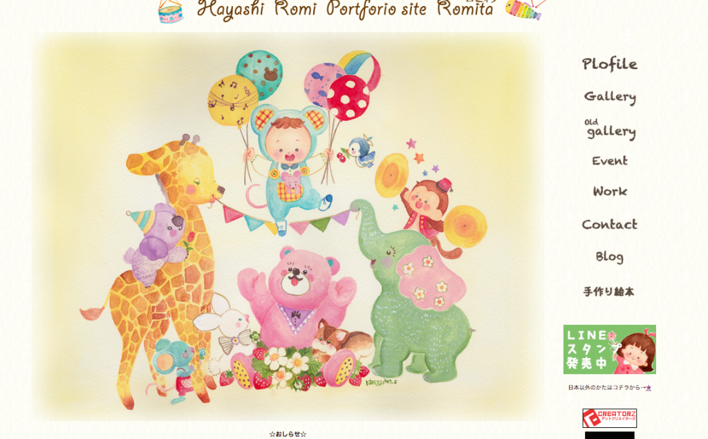 HPのTOPイラストを更新しました♪ 『まってたよ!』というタイトルです。 (http://romi.main.jp で大きい画像がみられます) おもちゃみたいな動物の仲間たちが、生まれてくる子供たちを「まってたよー!」と歓迎しているところ。 きりんとコアラとぞうは、私が赤ちゃんの頃によく遊んでいたぬいぐるみです。 無意識に、よくモチーフとして描いています。 きっと、絵の中の子供達を守ってくれるような気がしているんでしょうね。 &nb...